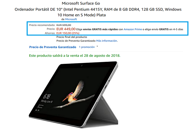 Ecco perché è possibile affermare con certezza che da questo momento in avanti anche su Amazon sarà possibile pre-ordinare il nuovissimo Microsoft Surface Go. E per alcuni mercati, tra l’altro, sono previsti sconti rilevanti sul già buono prezzo di vendita. In Spagna, un esempio per tutti, la percentuale di riduzione sfiora attualmente il 25%. Per quanto riguarda gli Stati Uniti i prezzi sono di 399 e 549 dollari rispettivamente per le varianti con memoria eMMC da 4 GB di RAM/64 GB di ROM e per quelle con memoria SSD da 8 GB di RAM/128 GB di ROM. Per quanto riguarda il resto delle specifiche, il Microsoft Surface Go ha un display da 10 pollici con una risoluzione massima di 1.800 x 1.200 pixel ed è alimentato da un Pentium con frequenza pari a 1,6 GHz.
